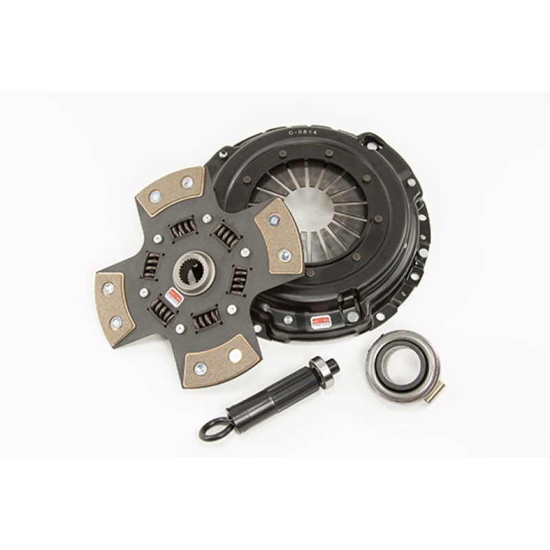 The Competition Clutch Stage 5 – Strip Series 1420 Clutch Kit, available with a double spring, and six rivet carriage is good for ease of gear transition with higher horsepower. This disc complimented by a performance pressure plate provides a 300% increase in torque capacity.The 1420 Series kit includes a performance pressure plate, a four-puck high torque sprung disc Ceramic buttons, all app